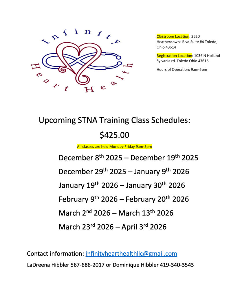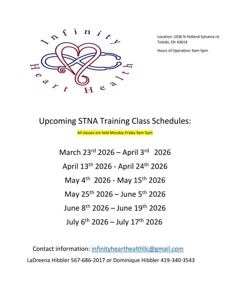 In today’s rapidly growing healthcare field, State Tested Nursing Aides (STNAs – also known as CNAs) are in great demand. Are you ready to take that step into a rewarding, long-lasting career? Infinity Heart health is committed to taking that journey with you. We hold our STNA certification training classes in Toledo, Ohio.